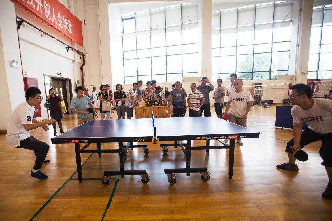 在师生乒乓球比赛中,发球抢攻、正手对攻、底线对拉等一个个回合的精彩厮杀,不时点燃着师生的激情,热血在这里沸腾。