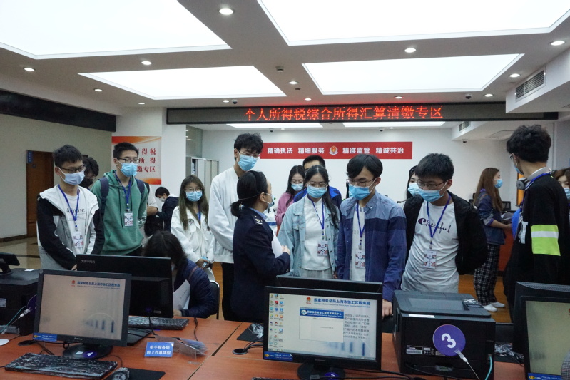 国产自拍 师生一行首先在徐汇区税务局办税服务厅负责人带领下参观了办税窗口及自助办税体验区,听取关于该局概况信息、窗口功能设置及各项办税缴费服务举措的介绍,并体验了自然人电子税务局相关功能,切实感受信息化办税的便捷高效。