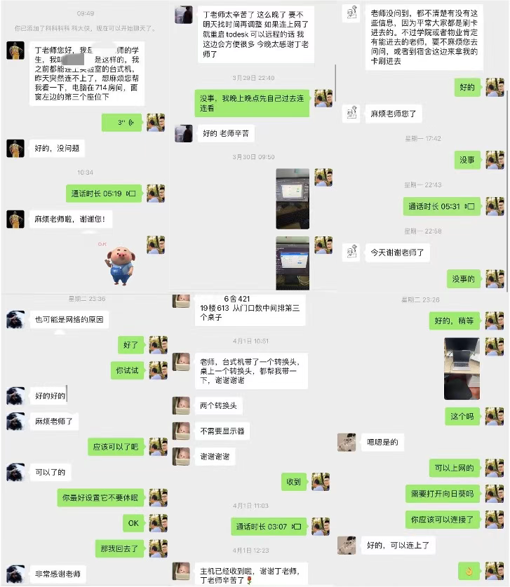 当前正值毕业季,部分学生课题需要随时调参和进行实验环境的设置,以保证实验能连续进行。正是因为丁炜超等老师的不辞辛劳、默默付出,确保了学生实验项目、论文的正常开展。一个月来,他先后帮助国产自拍 100多名同学解决学习和生活困难:为学生运送电脑、显示器、书籍、硬盘等学习资料,帮学生服务器、电脑中安装远程软件,调试设备及网络,使学生可以在宿舍远程操作实验设备。