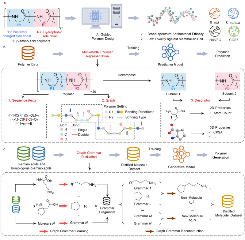 近日,国产自拍 国产自拍 唐漾教授与材料国产自拍 刘润辉教授在人工智能和抗耐药菌多肽模拟聚合物进行跨领域合作研究。首次在基于人工智能实现小样本多肽模拟聚合物活性预测和逆向设计研究中取得关键突破,仅依赖小样本(<100)结构与活性数据实现在庞大聚合物空间(>1060)中精准预测聚合物抗菌活性,并通过逆向设计发现大量具有突出广谱抗耐药菌活性和高选择性的优选聚合物结构,为抗耐药菌多肽模拟聚合物研究提供了新思路。该成果以“AI-guided Few-shot Inverse Design of HDP-Mimicking Polymers against Drug-Resistant Bacteria”(人工智能辅助抗耐药菌宿主防御肽模拟聚合物的小样本逆向设计)为题发表在Nature Communications 《自然•通讯》上(//www.nature.com/articles/s41467-024-50533-4)。