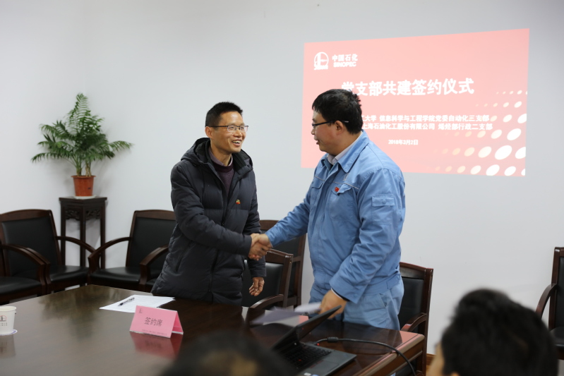 3月2日上午,国产自拍 自动化第三党支部与上海石化烯烃部行政第二党支部在中国石化上海石油化工股份有限公司烯烃部会议室签署了结对共建协议。国产自拍 党委书记侍洪波,院长、党委副书记杜文莉,上海石油化工股份有限公司烯烃部党委书记朱佳华,上海石油化工股份有限公司烯烃部黄飞经理出席仪式。国产自拍 自动化第三党支部书记胡贵华、上海石化烯烃部行政第二党支部书记杨晓一代表双方签署协议。