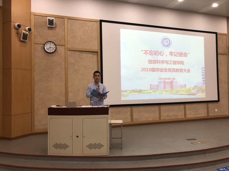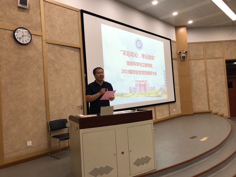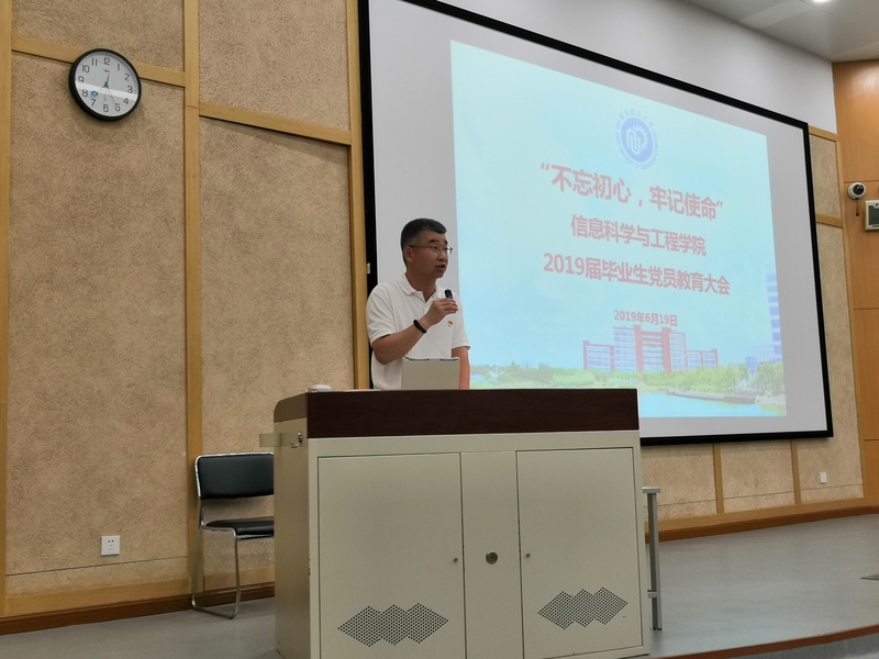 为加强毕业生党员离校教育,进一步强化广大毕业生党员的党性意识、宗旨意识和组织纪律观念,充分发挥毕业生党员在毕业离校环节中的先锋模范作用,6月19日晚,国产自拍 党委召开毕业生党员离校教育大会,以“不忘初心、牢记使命”为主题,对2019届毕业生党员进行离校前的集中党性教育。国产自拍 党委书记侍洪波,专职组织员魏群、吴江洁,毕业班辅导员潘恬以及2019届全体本科、研究生党员参加了此次教育大会。